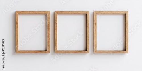 Three square oak wooden frames are suspended on a white wall, ready to display artworks, paintings, or posters. The frames are empty, emphasizing their simple and elegant design.