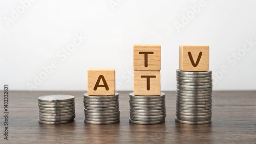 Three stacks of coins each with a wooden cube spelling ?VAT? on top; minimalist concept of tax and finance.