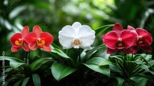 Three stunning orchids, red and white, thrive in a lush environment, illustrating the beauty and elegance of nature’s flora intertwined with serenity and tranquility.