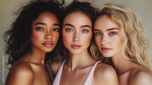 Three stunning women of different ethnicities and colors, each with flawless makeup and glossy lips, wearing light pink tank tops