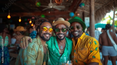 Three Stylish African American Men Enjoying Drinks at Tropical Beach Bar