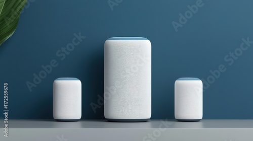 Three stylish smart speakers of varying sizes on a minimalist shelf against a blue wall, complemented by a green plant.