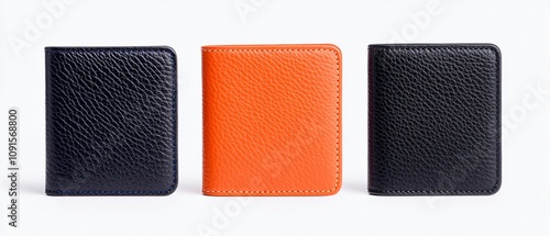Three stylish wallets: two in black and one in vibrant orange, showcasing a textured leather design.