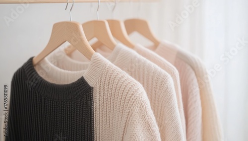 sweater, knit up, clothes, hanger, wooden, beige, cream, grey, fashion, warm, autumn, winter, apparel, clothing, style, soft, textile, design, neutral, colours, simple, organised, display, closet, hanging, natural, comfortable, wool, cashmere, accessory, home, interior, modern, light, minimal, texture, detail, closeup, cosy, minimalist, warmth, softness, relaxed, elegant, casual attire, boutique