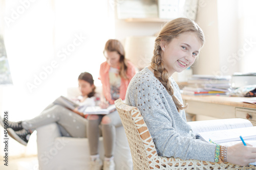 three, teenage, girl, homework, room, activity, adult, backlit, cape town, casual attire, chair, clothes, condensed, culture, day, desk, domestic, education, friendship, indoor, learn, lifestyle, people, to sit, smile, south africa, study, togetherness, write, youth