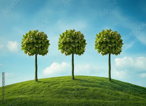 Three Topiary Trees Standing on a Green Hill Under a Blue Sky