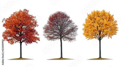 Three vibrant autumn trees showcasing fall colors: red, orange, and yellow against a white background.