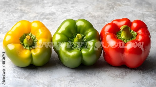 Three vibrant bell peppers in red, green, and yellow sit side-by-side on a textured gray surface. A fresh and healthy food image.