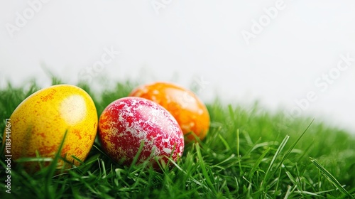 Three vibrant Easter eggs resting on lush green grass, contrasting beautifully with a clean white background, showcasing the essence of Easter celebration and springtime joy.