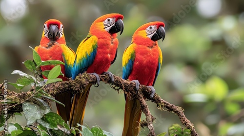 Three vibrant macaws perch on a branch, showcasing their colorful plumage against a lush green background.