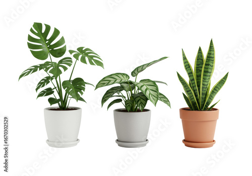 Three vibrant Monstera, Calathea, Sansevieria houseplants in modern pots, transparent studio background, soft high-key lighting, emphasizing natural well-being concept