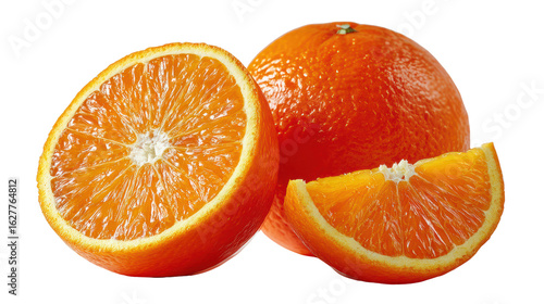 Three vibrant oranges, one sliced in half, showcasing its juicy interior and bright color.