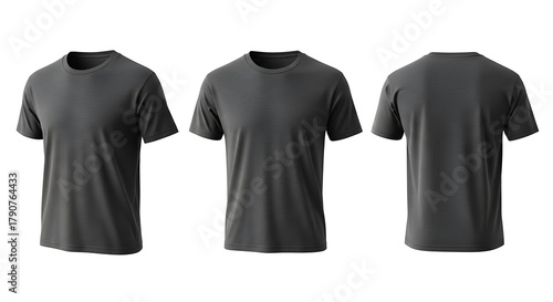 Three views of a plain dark gray tshirt, front, side, and back, isolated on a white background