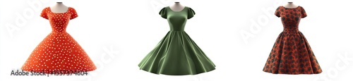 dress, vintage, retro, fashion, clothing, style, mannequin, red, orange, olive, green, brown, floral, patterned, printed, short, sleeve, round, neckline, full, skirt, fabric, design, model, display, elegant, stylish, beautiful, apparel, 1950s, 1940s, accessory, textile, classic