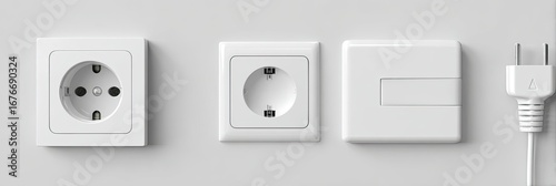 Three white electrical outlets and a plug, arranged horizontally on a light gray background