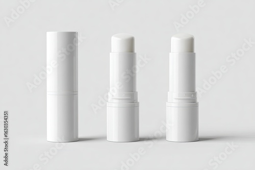 Three white lipstick-like containers, aligned. Empty, cylindrical packaging, simple design. Clean, studio shot