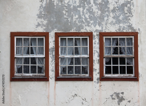 three windows on the shabby wall closed with curtains