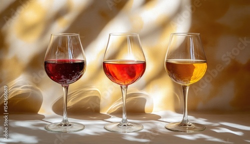 Three wine glasses, red, ros?, and white, under sunlit shadows