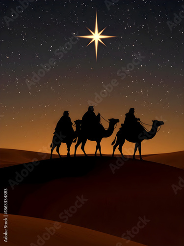 Three wise men riding camel following a star in the desert at night. Silhouette of the three wise men traveling on camels to Bethlehem for the birth of baby Jesus, offering symbolic gifts.