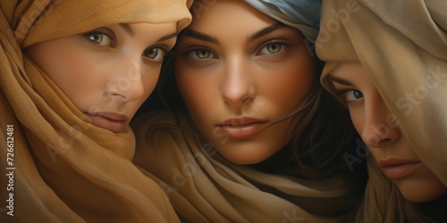 woman, diversity, culture, empowerment, painting, artwork, traditional, fashion, muslim, islamic, religion, foulard, portrait, three, group, friends, oneness, multicultural, ethnicity, identity, heritage, beauty, style
