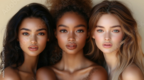 Three women with unique features pose closely together, highlighting their natural beauty and makeup. The warm light enhances their skin tones, creating a serene atmosphere in a studio