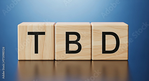 Three wooden blocks displaying the letters T B D against a gradient blue background concept to be determined