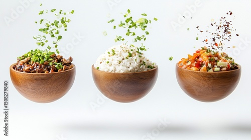 Three wooden bowls levitate against a white backdrop, each containing a different dish savory stir-fry, plain rice, and a vibrant vegetable medley.