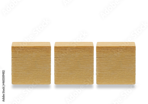 Three wooden cubes, wooden geometric shapes cube isolated on a white background