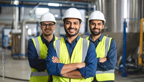men at work, factory, industrial, teamwork, safety, smiling, confidence, professional, equipment, positive, man, team, collaboration, production, manufacturing, safety-gear, helmet, uniform, yellow, focused, modern, efficient, happy, business, employee
