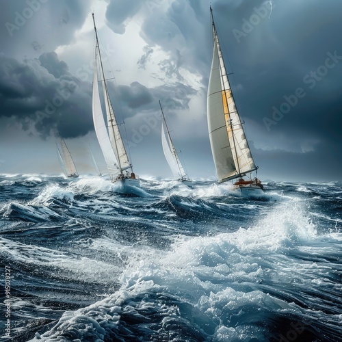 Three yachts with white sails navigating through turbulent seas under a moody sky