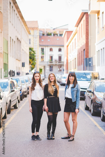 Three young beautiful women posing outdoor
