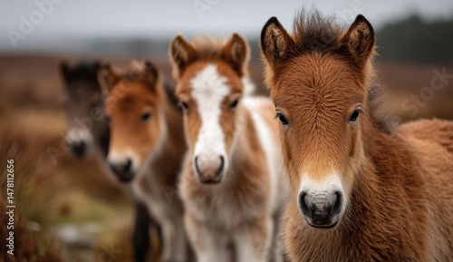 Three young foals stand close together in a field, their coats a mix of brown and white. A heartwarming autumn scene.