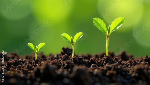 Three young plants grow from soil, showing different stages of development against a blurred green background. Concept of growth process. Spring is coming