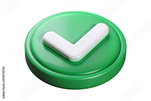 Three-dimensional rendered checkmark button in green with white approval concept illustration.