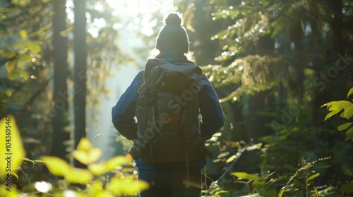 Through the dappled sunlight we see a lone hiker standing with back to the camera taking a moment to rest and appreciate the . .