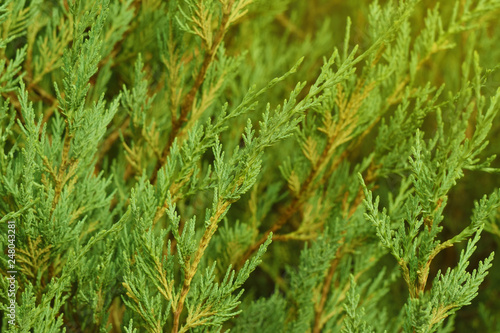 Thuja leaves in sunshine light, green thuja leaf, natural thuja trees close up in warm light. Background with copy space