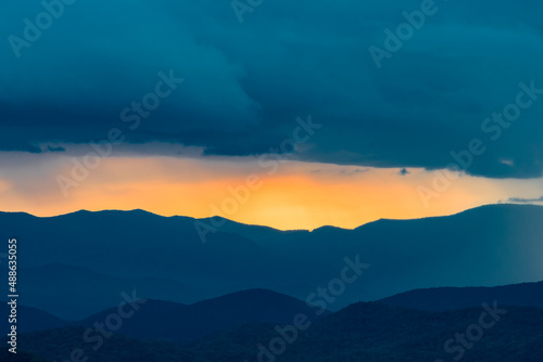 Thunder clouds hover over dramatic sunset at the Blue Ridge Mountains in Pisgah Forest