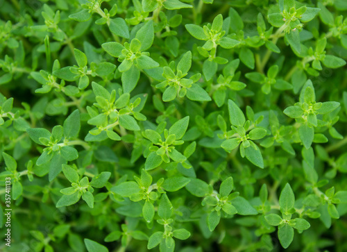 Thyme strings. Fresh green thyme plant growing in a herb garden. Breckland, Thymus serpyllum, Thymus vulgaris, Common Thyme, Whole thyme. Herbs for cooking. Selective focus, closeup.