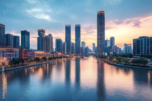 Tianjin Skyline Sunset: A Panoramic View of Tianjin City as the Sun Sets, Highlighting Modern Skyscrapers and Historic Architecture by the Hai River