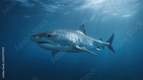 shark, ocean, underwater, marine life, wildlife, predator, swimming, powerful, animal, nature, deep blue, water, sunlight, photo, image, photographic, underwater photography, oceanography, conservation, environment, sea, illuminated, fin, tail, hunting, marin, fauna, large, exotic, amazing, beautiful, closeup