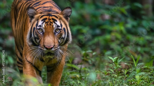 Tiger walking through dense jungle, endangered wildlife species protection and rainforest conservation concept.