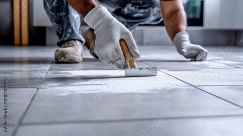 Tiler grouting tiles in a modern kitchen. Featuring care and technique