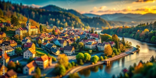 Tilt-Shift Miniature Landscape: Dark Brown & Sky Blue Gradient Background with Noise Texture