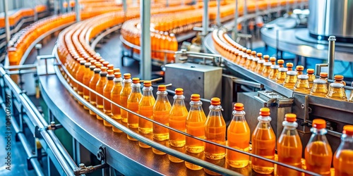Tilt-Shift Photography of a Production Line for Bottled Beverages in an Orange Drink Manufacturing Facility, Showcasing the Bottling Process and Equipment in Action