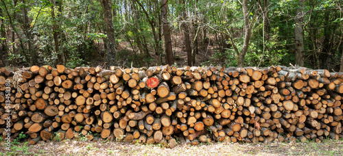 Timber storage, tree log stack background. Firewood stock in forest. Round trunk cut in sawmill