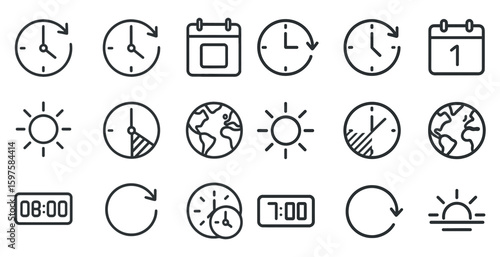 time, date, clock, calendar, time management, outline, linear, schedule, line, vector, icon, set, digital, analog, alarm, stopwatch, wristwatch, deadline, appointment, reminder, event, timeline, clock dial, meeting