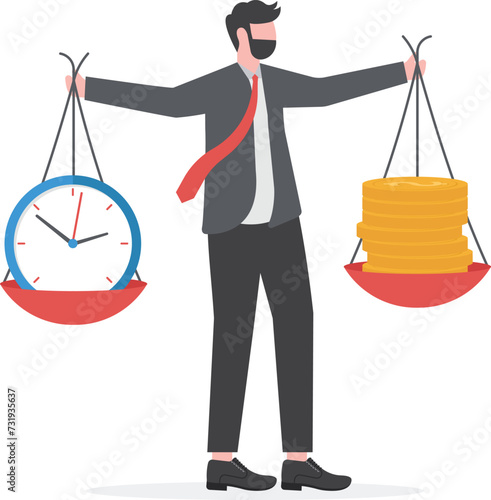 Time and money balance, weight between work and life, long term investment or savings, control or make decision concept, cheerful business woman balance between time clock and dollar money