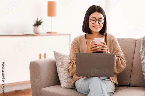 Time For Coffee. Portrait of asian female student in eyeglasses drinking coffee at home and using computer, working online, copy space. Lady in eyewear holding cup, sitting on sofa at home office