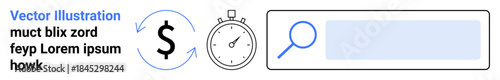 Time management, cost analysis, financial value, efficiency, search tools, and digital economy. Dollar sign, stopwatch magnifying glass on a search bar. Time management and cost analysis concept
