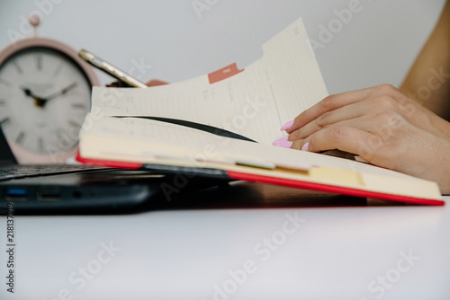 Time planning by a woman. A woman holding a red calendar in her hand, the telephone next to a laptop lies. The businesswoman plans her work day, writes dates in the schedule.